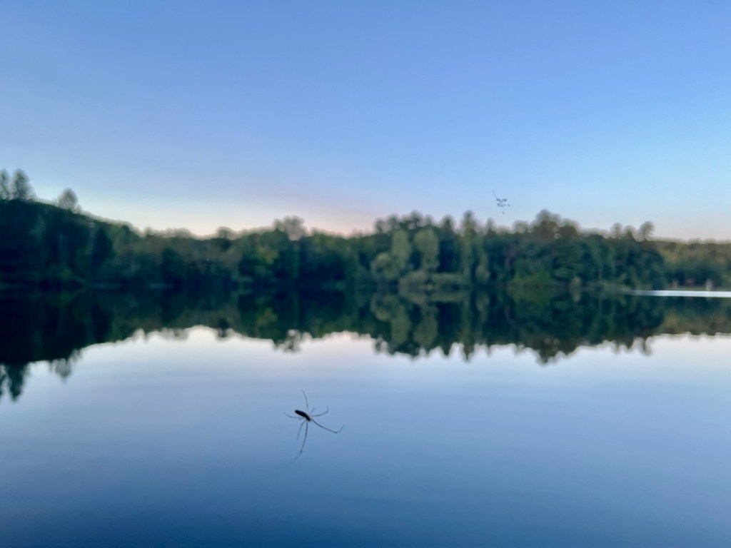 During my walk tonight, I saw a spider weaving her web. I could have looked at her forever, how delicately she was pulling her barely visible thread, how even she made every section, how she alternated her long legs. It was magic. I looked at the surface of the lake, where from time to time the had or the back of some fish broke the surface and made circles run through the water.