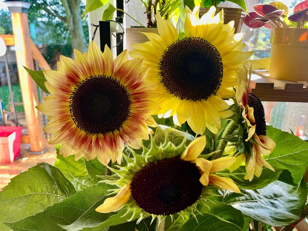 MA brought me sunflowers as a thank you for dog-sitting Luna. Real sunflowers, half my height with thick tree-like stems and meaty leaves. They smell wonderfully un-flower-like, like food and comfort. I wonder if those sunflowers are an accidental gesture or if she knew. Sunflowers are the symbol of my home, of my identity. My mum says her folk planted sunflowers and corn along the fence, so that no space gets wasted.